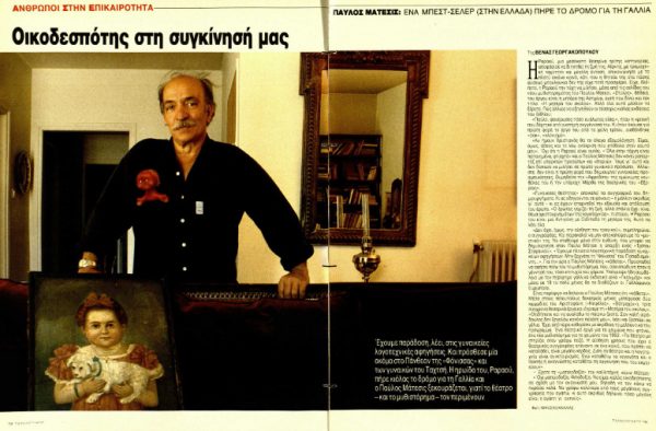 *Δημοσίευμα του «Ταχυδρόμου» της 13ης Σεπτεμβρίου 1990 αφιερωμένο στον Παύλο Μάτεσι, υπό τον τίτλο «Οικοδεσπότης στη συγκίνησή μας». Ο συγγραφέας είχε συνομιλήσει με τη δημοσιογράφο Βένα Γεωργακοπούλου, με αφορμή την εκδοτική επιτυχία του μυθιστορήματός του «Η μητέρα του σκύλου», που είχε πάρει ήδη το δρόμο για το εξωτερικό.