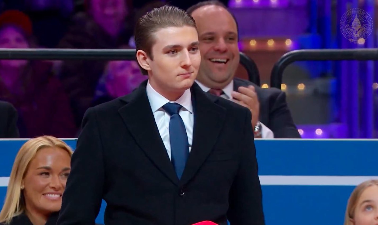 🚨 THERE HE GOES! Barron Trump is loving the cheers, puts his hand up to his ear and eggs on the crowd to chant his name.