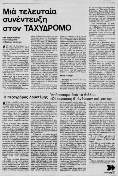 *Κείμενο του «Ταχυδρόμου» αφιερωμένο στον Μενέλαο Λουντέμη. Είχε δημοσιευτεί λίγες ημέρες μετά το θάνατο του σημαντικού λογοτέχνη, στο τεύχος της 27ης Ιανουαρίου 1977.