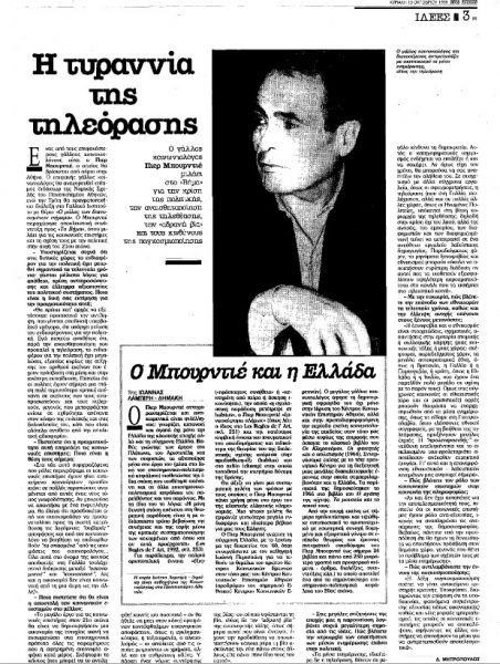*Κείμενο της κοινωνιολόγου, πανεπιστημιακού και συγγραφέως Ιωάννας Λαμπίρη – Δημάκη (έφυγε από τη ζωή το 2004), που έφερε τον τίτλο «Ο Μπουρντιέ και η Ελλάδα» και είχε δημοσιευτεί στην εφημερίδα «Το Βήμα» την Κυριακή 13 Οκτωβρίου 1996.