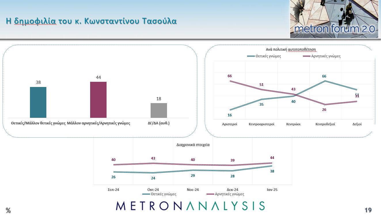 Την πιο αρνητική γνώμη για τον κ. Τασούλα έχουν όσοι αυτοπροσδιορίζονται ως αριστεροί και κεντροαριστεροί, ενώ τις πιο πολλές θετικές γνώμες έχει μεταξύ των κεντροδεξιών. Ενδιαφέρον είναι ότι καταγράφεται ένα ποσοστό 31% των δεξιών με αρνητική γνώμη.