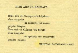*Από την ποιητική συλλογή του Τάσου Γαλάτη «Ανιπτόποδες και Σφενδονήτες» (εκδόσεις Γαβριηλίδης, 2005), που χάρισε στον ηλείο την καταγωγή (από τη Νέα Φιγαλεία ή Ζούρτσα) ποιητή και εκπαιδευτικό (Αναστάσιος Παπαδόπουλος το πραγματικό όνομά του) το Κρατικό Βραβείο Ποίησης το 2006.