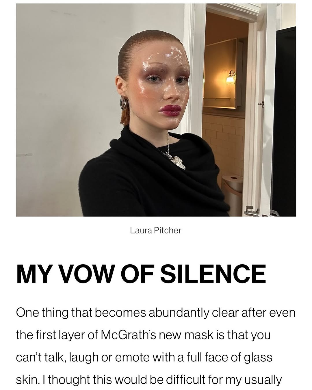 Ένα πράγμα που γίνεται απολύτως σαφές ακόμη και μετά την πρώτη στρώση της νέας μάσκας της McGrath είναι ότι δεν μπορείτε να μιλήσετε, να γελάσετε ή να εκφράσετε συναισθήματα με ένα πρόσωπο από γυάλινο δέρμα. Νόμιζα ότι αυτό θα ήταν δύσκολο για τον συνήθως φλύαρο εαυτό μου, μέχρι που έριξα μια ματιά στο νέο μου πορσελάνινο πρόσωπο στον καθρέφτη.