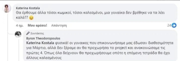 «Υπήρξαν κάποιες αντιδράσεις από γυναίκες κωμικούς που θεώρησαν ότι λίγο πρώιμα πως δεν βάζουμε γυναίκες. Υπήρχε μια αφίσα μόνο με άντρες. Δεν κατάλαβα ποιο ήταν το μεμπτό. Δεν καταλαβαίνω πώς πάει η ποσόστωση στο θέατρο.