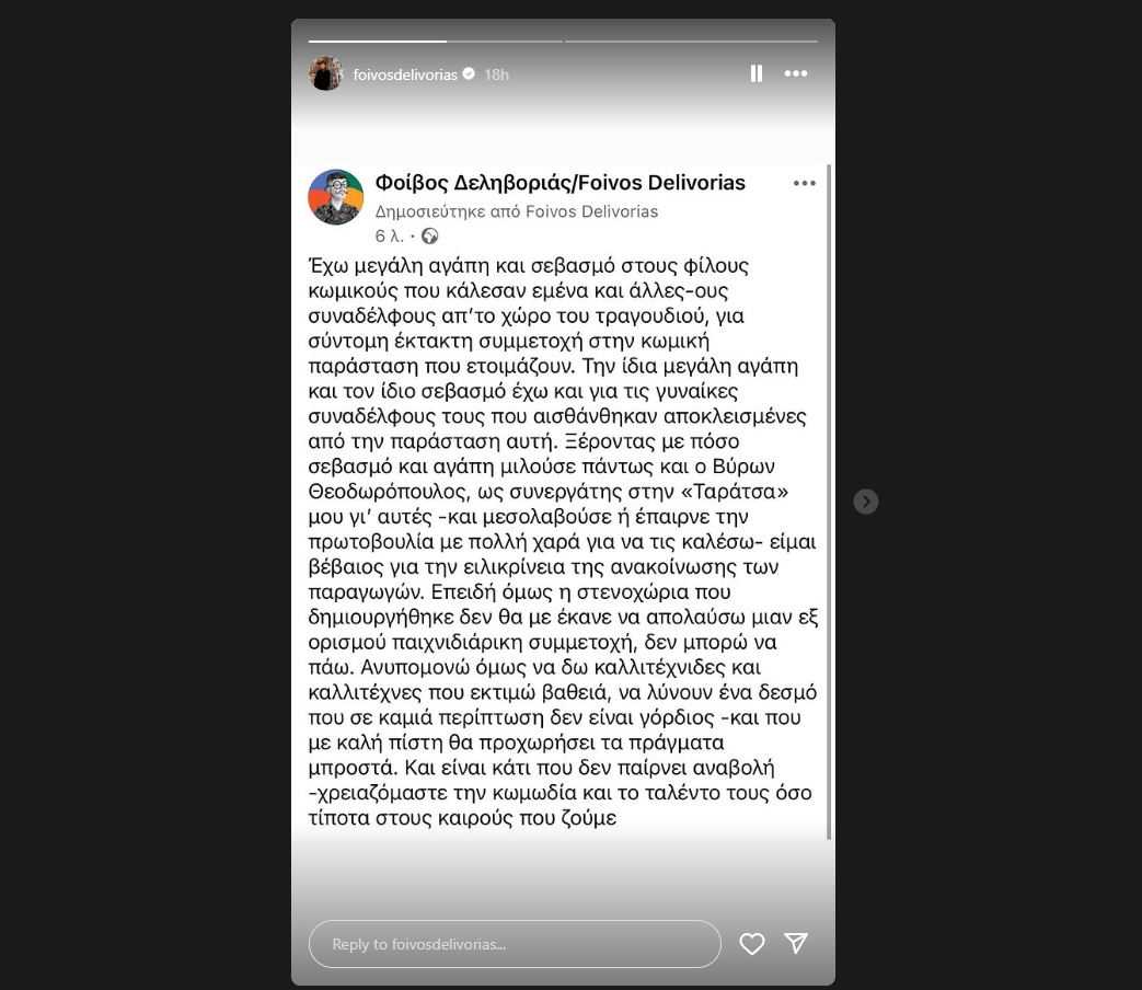 Ο Φοίβος Δεληβοριάς και η Νατάσσα Μποφίλιου ενημέρωσαν ότι αποσύρουν τη συμμετοχή τους από την παράσταση.