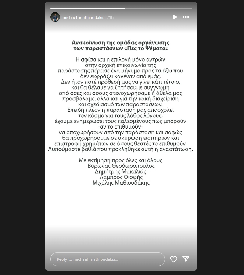 Την είδηση έκανε γνωστή ο κωμικός Μιχάλης Μαθιουδάκης όποιός έγραψε σε ανάρτησή του: «Λόγω των γεγονότων των τελευταίων δέκα ημερών οι παραστάσεις του «Πες το ψέματα» ακυρώνονται. Ευχαριστούμε πολύ τους θεατές που αγοράσανε εισιτήρια και λυπούμαστε για την αναστάτωση. Η παραγωγή θα προχωρήσει σε ακύρωση εισιτηρίων και επιστροφή των χρημάτων. Ελπίζουμε να σας δούμε ξανά σε κάποια μελλοντική παράσταση».