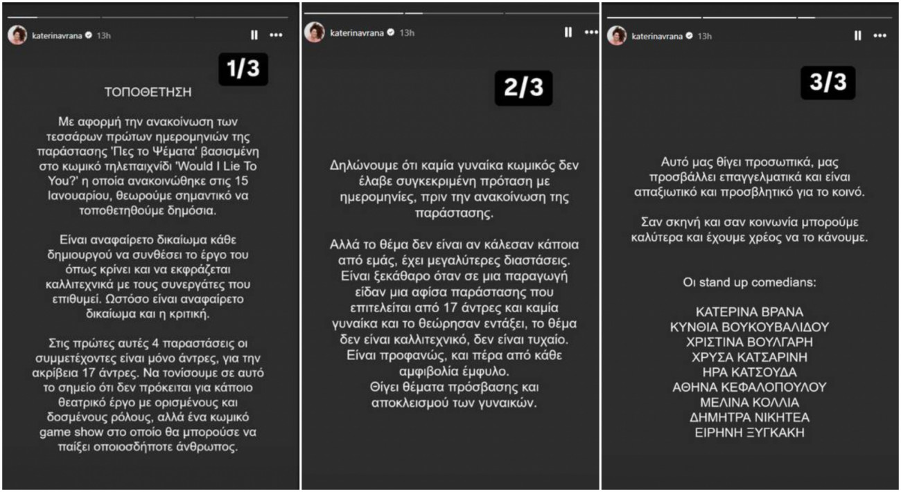 «Με αφορμή την ανακοίνωση των τεσσάρων πρώτων ημερομηνιών της παράστασης ‘Πες τo Ψέματα’ βασισμένη στο κωμικό τηλεπαιχνίδι ‘Would I Lie To You?’ η οποία ανακοινώθηκε στις 15 Ιανουαρίου, θεωρούμε σημαντικό να τοποθετηθούμε δημόσια.