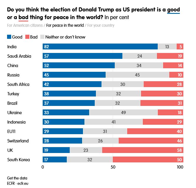 Mε βάση την έρευνα του ECFR, στην Ινδία, τη Σαουδική Αραβία, τη Ρωσία, την Κίνα και τη Νότια Αφρική, τρεις στους πέντε ανθρώπους πιστεύουν στην υπόσχεση του Τραμπ για άμεση ειρήνευση στην Ουκρανία. Ένας στους δύο πιστεύει ότι θα επιτύχει ειρήνη στη Μέση Ανατολή. Επίσης, η διεθνώς επικρατούσα άποψη είναι ότι θα εξυγιάνει τις σχέσεις της Ουάσινγκτον με το Πεκίνο – κάτι που όμως υποστηρίζουν μόλις οι μισοί από τους Κινέζους συμμετέχοντες στη δημοσκόπηση.