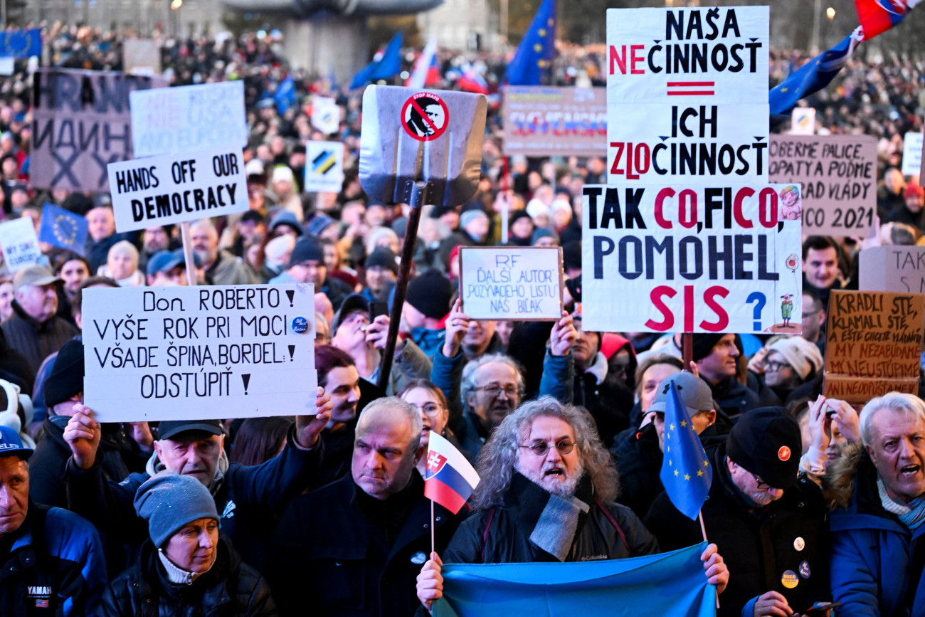 Ειδικότερα, δεκάδες χιλιάδες διαδηλωτές συγκεντρώθηκαν σήμερα Παρασκευή 24 Ιανουαρίου στην κεντρική πλατεία της Μπρατισλάβας, κρατώντας πλακάτ με συνθήματα. Ταυτόχρονα η ένταση μεταξύ της κυβέρνησης και της αντιπολίτευσης διογκώνεται.