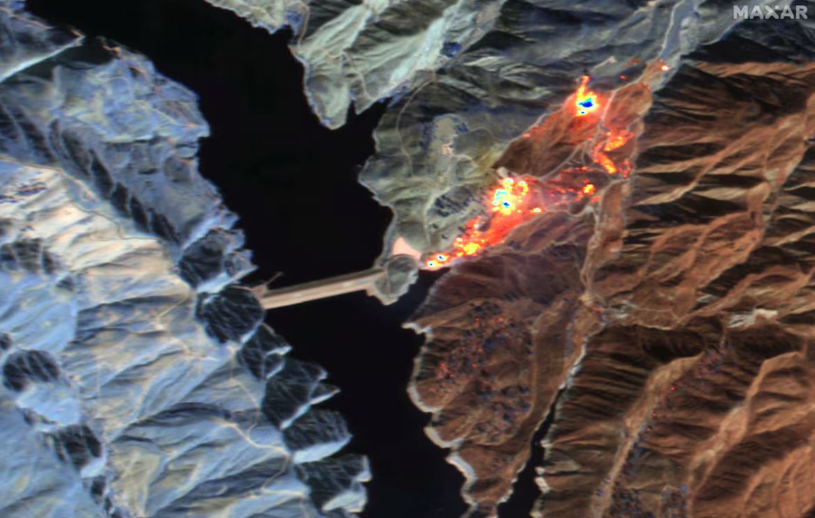 Υπέρυθρη εικόνα του δορυφόρου MAXAR που δείχνει μια από τις νέες εστίες δασικής πυρκαγιάς στην Καλιφόρνια.