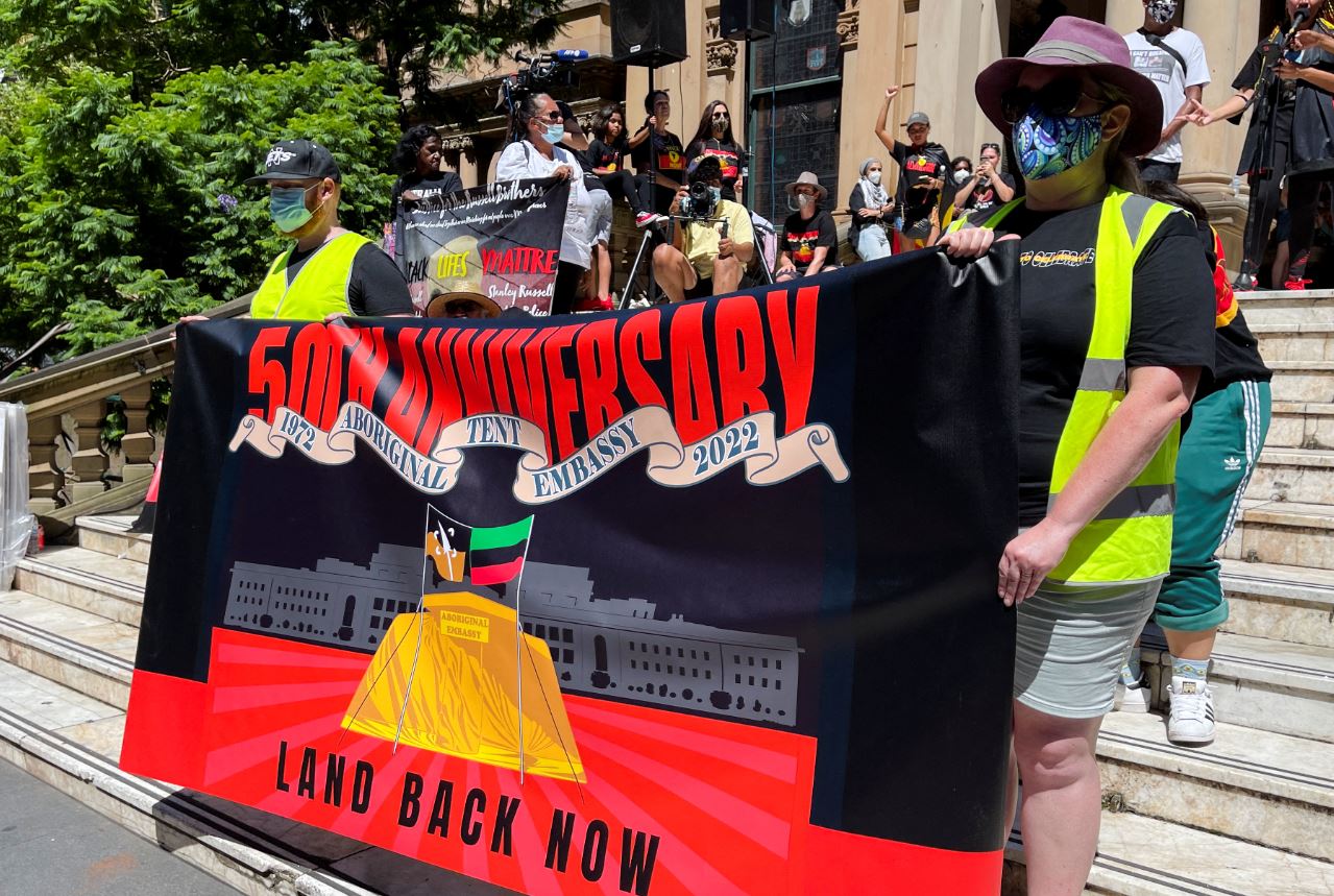 Συνθήματα που έγραφαν «η Αποικία θα Πέσει», «Βρίσκεστε σε Κλεμμένη Γη», «Καταργήστε την Αυστραλία» και «Γ@μώ την Αποικία» κάλυπταν τους τοίχους των τεντών, όπου είχαν στηθεί δεκάδες καρέκλες.