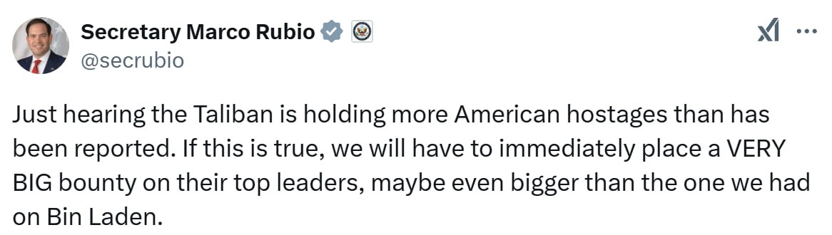 «Μόλις άκουσα πως οι Ταλιμπάν κρατούν περισσότερους αμερικανούς ομήρους απ’ ό,τι αναφερόταν μέχρι τώρα», ανέφερε ο κ. Ρούμπιο μέσω X.