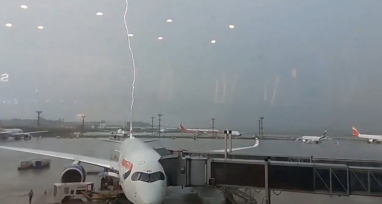 Amazing video captures lightning striking a British Airways A350-1041 at Sao Paulo Guarulhos International Airport.