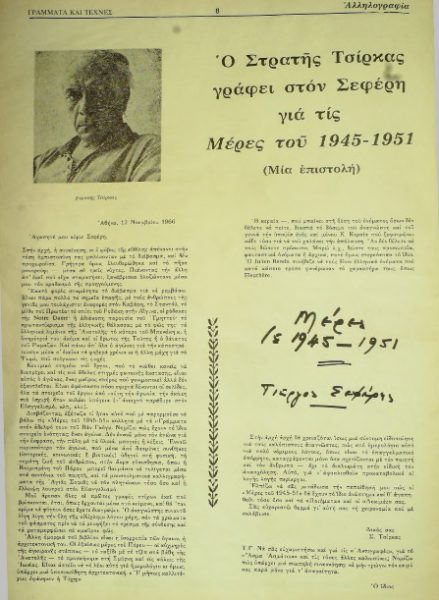 * Επιστολή του Στρατή Τσίρκα προς τον Γιώργο Σεφέρη αναφορικά με το ημερολόγιο του τελευταίου «Μέρες 1945-1951». Είχε δημοσιευτεί στο περιοδικό «Γράμματα και Τέχνες» (μηνιαία επιθεώρηση τέχνης, κριτικής και κοινωνικού προβληματισμού) τον Οκτώβριο του 1982 (αρ. φύλλου 10).