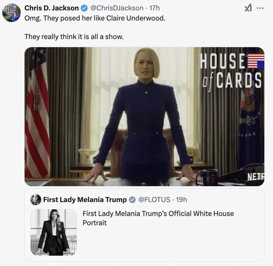 Ετοιμάζει νέο ντοκιμαντέρ για τη ζωή και τις αλλαγές σε αυτή, έβγαλε το δικό της κρυπτονόμισμα, έχει πλέον σιγουριά ότι ο Μπάρον Τραμπ μπορεί να ακολουθήσει το δικό του δρόμο και το νέο της πορτρέτο θυμίζει πολύ την Κλερ Άντεργουντ, την οποία υποδύθηκε η Ρόμπιν Ράιτ, στο House Of Cards.