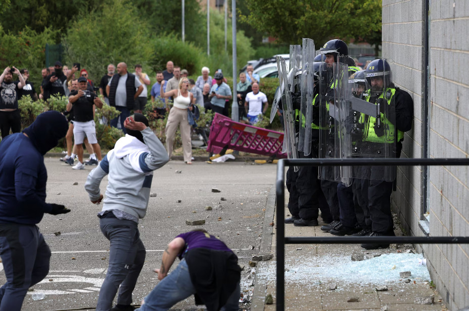 Διαδηλωτές πετούν αντικείμενα σε αστυνομικούς κατά τη διάρκεια διαδήλωσης κατά της μετανάστευσης, στο Ρόδεραμ | Βρετανία | 4 Αυγούστου. REUTERS/Hollie Adams