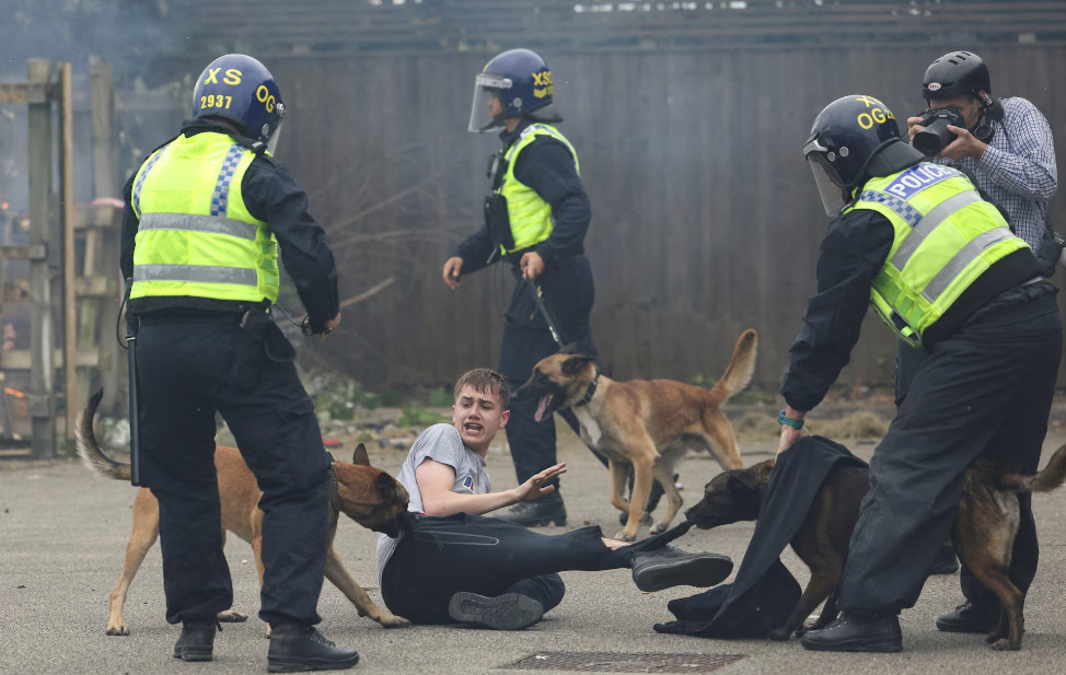 Σκύλοι της αστυνομίας επιτίθενται σε έναν άνδρα κατά τη διάρκεια διαδήλωσης στο Ρόδεραμ | Βρετανία | 4 Αυγούστου. REUTERS/Hollie Adams