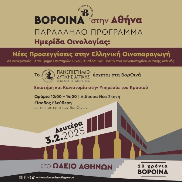 Η πολυαναμενόμενη οινική εκδήλωση “ΒορΟινά”, με τα εξαιρετικά κρασιά και αποστάγματα των «Οινοποιών Βορείου Ελλάδος» επιστρέφει και πάλι στο καθιερωμένο ραντεβού της με το αθηναϊκό -και όχι μόνο- κοινό, τη Δευτέρα 3 Φεβρουαρίου 2025, συμπληρώνοντας 20 χρόνια από την πρώτη της διοργάνωση!