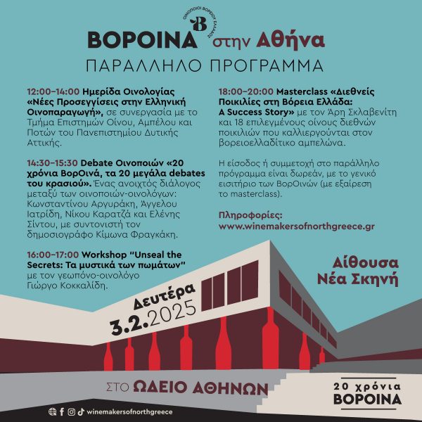 Λεπτομέρειες για το πρόγραμμα των παράλληλων εκδηλώσεων, την εκδήλωση-έκθεση «ΒορΟινά στην Αθήνα», τα οινοποιεία που συμμετέχουν, την είσοδο και πολλά πολλά ακόμη, θα βρείτε στην ιστοσελίδα www.winemakersofnorthgreece.gr