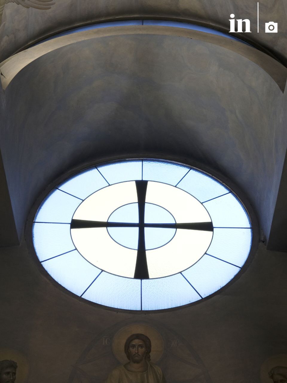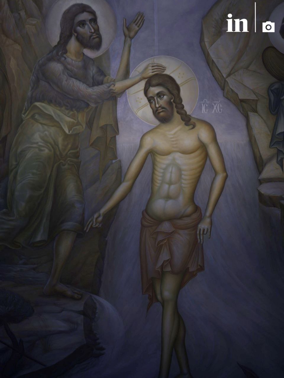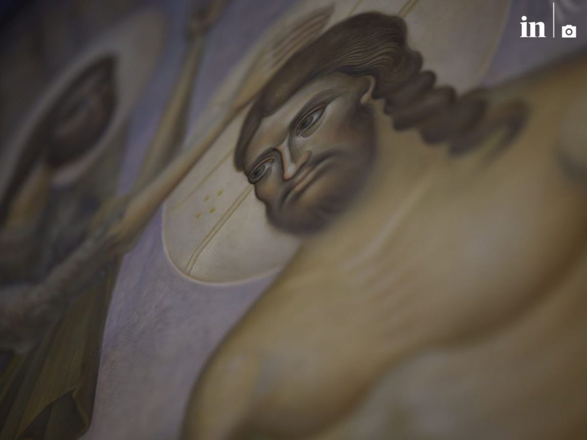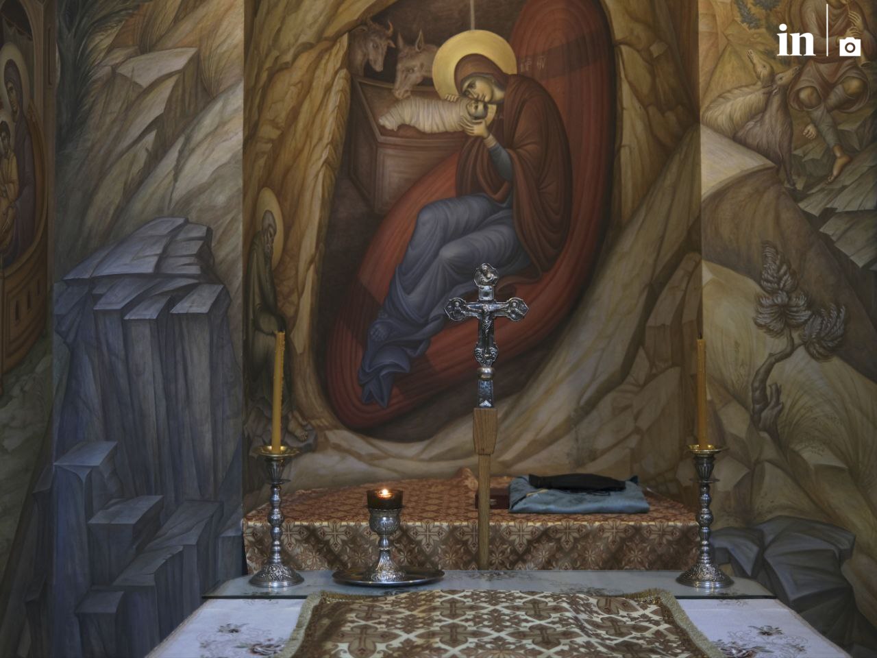 Και εξηγεί τι βλέπουμε στον χώρο: «Στην ανατολική πλευρά έχουμε μια σύνθεση, τη σύνθεση της γέννησης του Ιησού η οποία εξελίσσεται σε διάφορα επεισόδια. Στον καταρράκτη των Αγγέλων συναντάμε την τεχνική της γραμμικής φωτοσκίασης σε μονοχρωμία. Βγαίνοντας έξω έχουμε δύο άλλες παραστάσεις που είναι η γέννηση και η μεταμόρφωση. Ένα τρίπτυχο τριών σκηνών που υπάρχει η παρουσία και των τριών προσώπων της Αγίας Τριάδας.