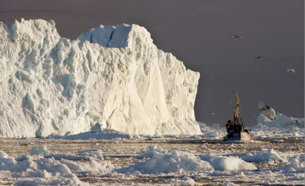Aλιευτικό σκάφος πλέει κοντά σ’ ένα τεράστιο παγόβουνο στην είσοδο του φιόρδ Jakobshavns κοντά στην Ιλουλισάτ της Γροιλανδίας (φωτογραφία Bob Strong/Reuters)