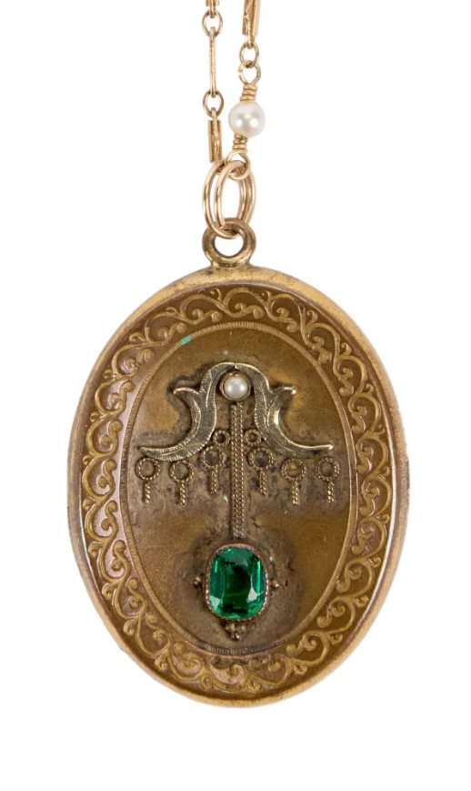 Η δημοπρασία περιλαμβάνει επίσης και ένα χρυσό οβάλ μεταλλικό περιδέραιο με ψεύτικες πράσινες πέτρες και μαργαριτάρια. Σε αυτό υπάρχει και ένα κομμάτι από τα μαλλιά του Κοέν.