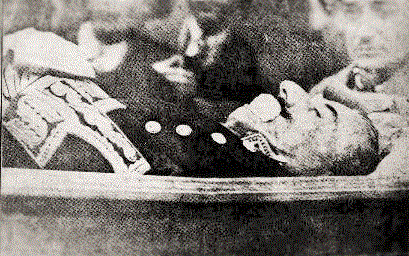 Εις τις σκάλες, τους διαδρόμους, γύρω εις το φέρετρον κόσμος με σκυμμένα κεφάλια. Οι άνθρωποι που απετέλεσαν το άμεσον περιβάλλον του ζάρωσαν στις γωνίες ακίνητοι, αμίλητοι. Κάτω από το φως τεσσάρων λαμπάδων κύπτουν όλοι διά ν’ ασπασθούν άλλοι το μέτωπον και άλλοι το μικρόν εικόνισμα που φέρει επί του στήθους ο νεκρός. Ο ύστατος ασπασμός των φίλων, η υστάτη συνδιαλλαγή των εχθρών τής χθες προς τον απερχόμενον.