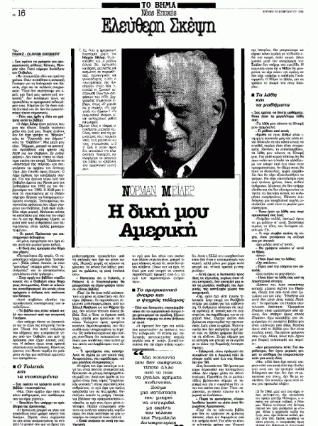 *Άρθρο που έφερε τον τίτλο «Νόρμαν Μέιλερ – Η δική μου Αμερική» και είχε δημοσιευτεί στην εφημερίδα «Το Βήμα» την Κυριακή 25 Φεβρουαρίου 1996. Ο Μέιλερ είχε παραχωρήσει την ανωτέρω ενδιαφέρουσα συνέντευξη στο γαλλοαμερικανό δημοσιογράφο, συγγραφέα και τηλεοπτικό παρουσιαστή Franz-Olivier Giesbert.
