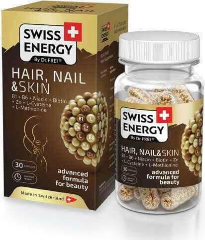 Οι κάψουλες Swiss Energy Hair Nail & Skin περιέχουν έναν επιλεγμένο συνδυασμό βιταμινών, μετάλλων, αμινοξέων (B1, B5, B6, PP, H + Zn + Fe + L-Κυστεΐνη + L-Μεθειονίνη) και ιατρικό εκχύλισμα μαγιάς για την τόνωση της ανάπτυξης των μαλλιών και την αποκατάσταση της δομής τους. Επιπλέον ενισχύουν τα νύχια και διατηρούν την επιδερμίδα υγιή και λαμπερή. Τα αμινοξέα (κυστεΐνη, μεθειονίνη) βοηθούν στην παραγωγή της κερατίνης των μαλλιών και των νυχιών. Τα μέταλλα (ψευδάργυρος, σίδηρος) βοηθούν την αναγέννηση των κυττάρων.