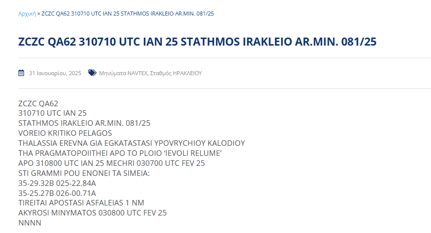 Η περιοχή βρίσκεται σε ανοιχτή θάλασσα, στα διεθνή ύδατα. Η Ελλάδα έχει εκδώσει Navtex, για εργασίες από τα ιταλικά ερευνητικά πλοία «NG Worker» και Ievoli Relume.