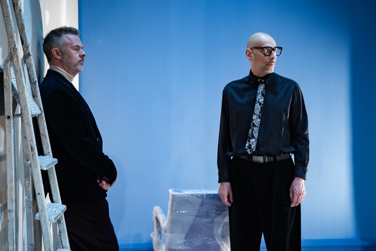Ο Φιντέλ Ταλαμπούκας ως Γιόργκεν Τέσμαν και ο Χρήστος Λούλης ως Δικαστής Μπρακ στην παράσταση Έντα Γκάμπλερ