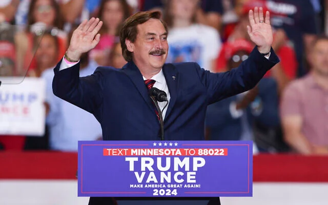 Ο διευθύνων σύμβουλος της MyPillow, Μάικ Λίντελ, μιλάει σε συγκέντρωση υπέρ του υποψήφιου των Ρεπουμπλικανών για την προεδρία και πρώην προέδρου των ΗΠΑ Ντόναλντ Τραμπ, 27 Ιουλίου 2024, στο Σεντ Κλάουντ της Μινεσότα.