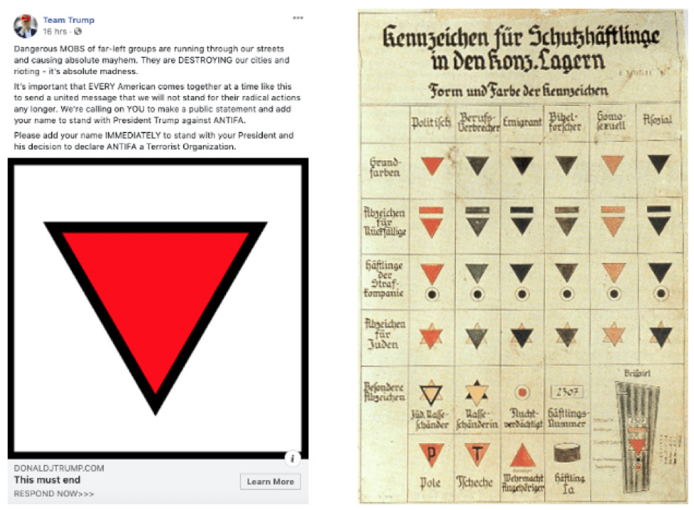 Τον Ιούνιο του 2020, το Facebook αφαίρεσε τις διαφημίσεις της προεκλογικής εκστρατείας του Τραμπ για εικονογράφηση που επικαλείται τα σύμβολα των ναζιστικών στρατοπέδων συγκέντρωσης και «παραβιάζει την πολιτική μας κατά του οργανωμένου μίσους».