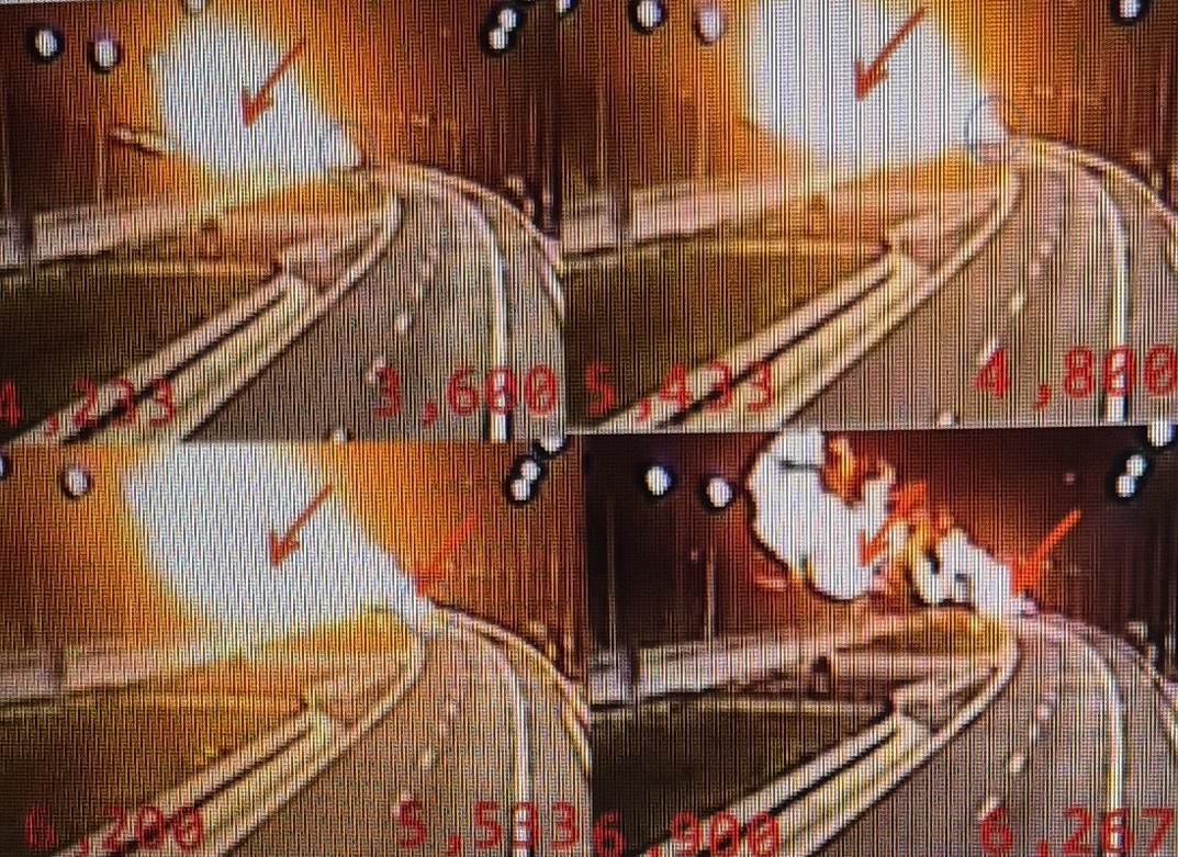 Από τον έλεγχο στα βίντεο που καταγράφουν τις πορείες των δύο αμαξοστοιχιών, οι ερευνητές διαπίστωσαν ότι το πρώτο ηλεκτρικό τόξο που δημιουργεί βραχυκύκλωμα και φωτεινή λάμψη σημειώνεται μόλις έξι κλάσματα του δευτερολέπτου μετά τη σύγκρουση.