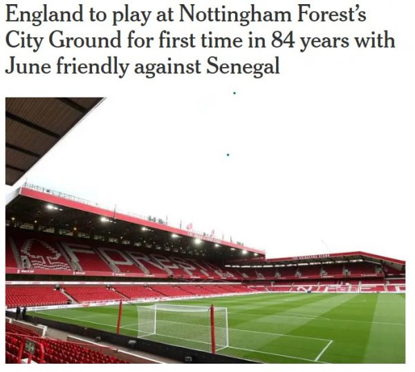 Οι επτά από αυτές καταγράφηκαν στο ιστορικό γήπεδο «City Ground» , το οποίο σταδιακά εκσυγχρονίζεται όπως αναφέρει το αγγλικό τμήμα «The Athletic» της εφημερίδας «The New York Times». Η ποδοσφαιρική ομοσπονδία έχει καλέσει τη Σενεγάλη να είναι αντίπαλος της εθνικής ομάδας για φιλικό στο τέλος της σεζόν προκειμένου να δώσει στον νεοφερμένο ομοσπονδιακό εκλέκτορα, Γερμανό Τόμας Τούχελ, επιπλέον ευκαιρίες γνωριμίας με τους διεθνείς Άγγλους ποδοσφαιριστές.