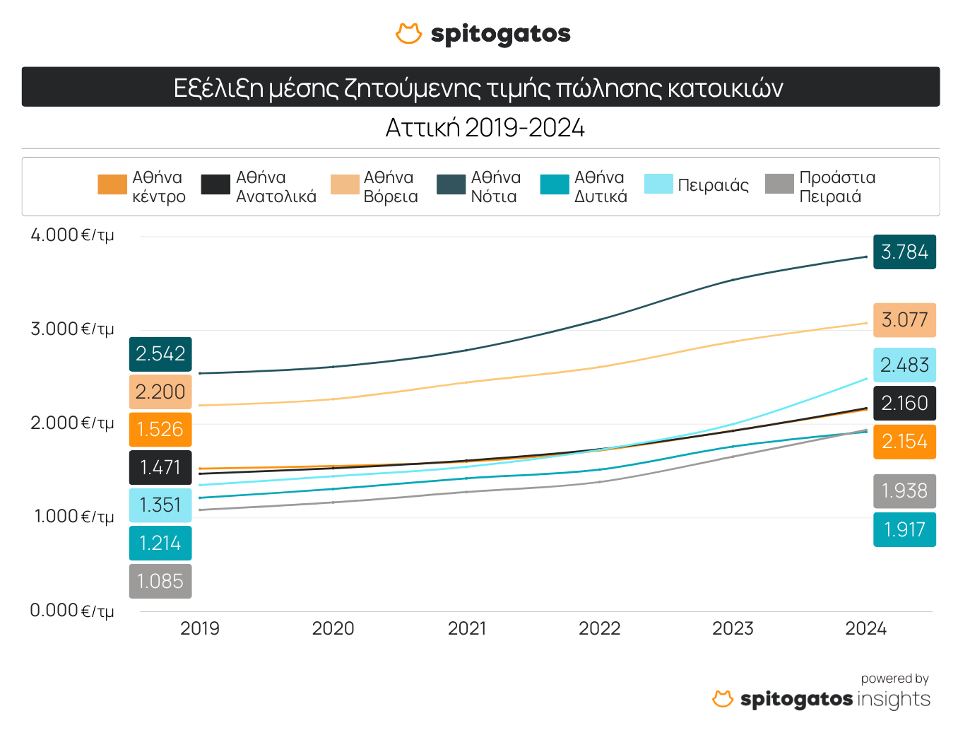 Την περίοδο 2019-2024 οι τιμές πώλησης ακινήτων στην Αττική σημειώνουν αυξήσεις που σε κάποιες περιπτώσεις κόβουν την ανάσα. Ο Πειρειάς ξεχωρίζει, με εκρηκτική άνοδο 83,8% στις μέσες ζητούμενες τιμές πώλησης, γεγονός που αποδίδεται, μεταξύ άλλων, στη ραγδαία αναβάθμιση του παραλιακού μετώπου και στις αλλαγές στο πρόγραμμα της Golden Visa. Στη δεύτερη θέση βρίσκονται τα Προάστια του Πειραιά, ενώ τα Δυτικά Προάστια της Αθήνας συνεχίζουν να κερδίζουν έδαφος, προσελκύοντας νέους αγοραστές λόγω των προσιτών τιμών τους και της βελτίωσης των υποδομών τους.