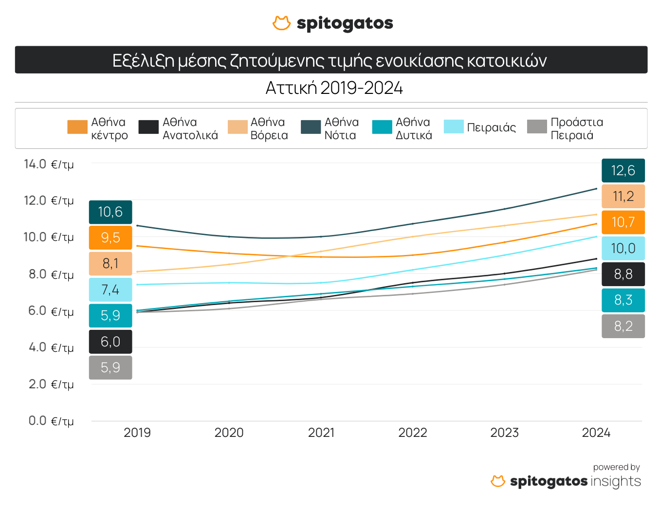 Την πρώτη θέση στην αύξηση τιμών την περίοδο 2019 – 2024 καταλαμβάνουν τα Ανατολικά Προάστια της Αθήνας, όπου οι μέσες ζητούμενες τιμές ενοικίασης σημείωσαν θεαματική άνοδο 49,7%. Ακολουθούν τα Προάστια του Πειραιά με αύξηση 40,1%, ενώ στην τρίτη θέση βρίσκονται τα Δυτικά Προάστια της Αθήνας, όπου οι τιμές αυξήθηκαν κατά 38,8%.