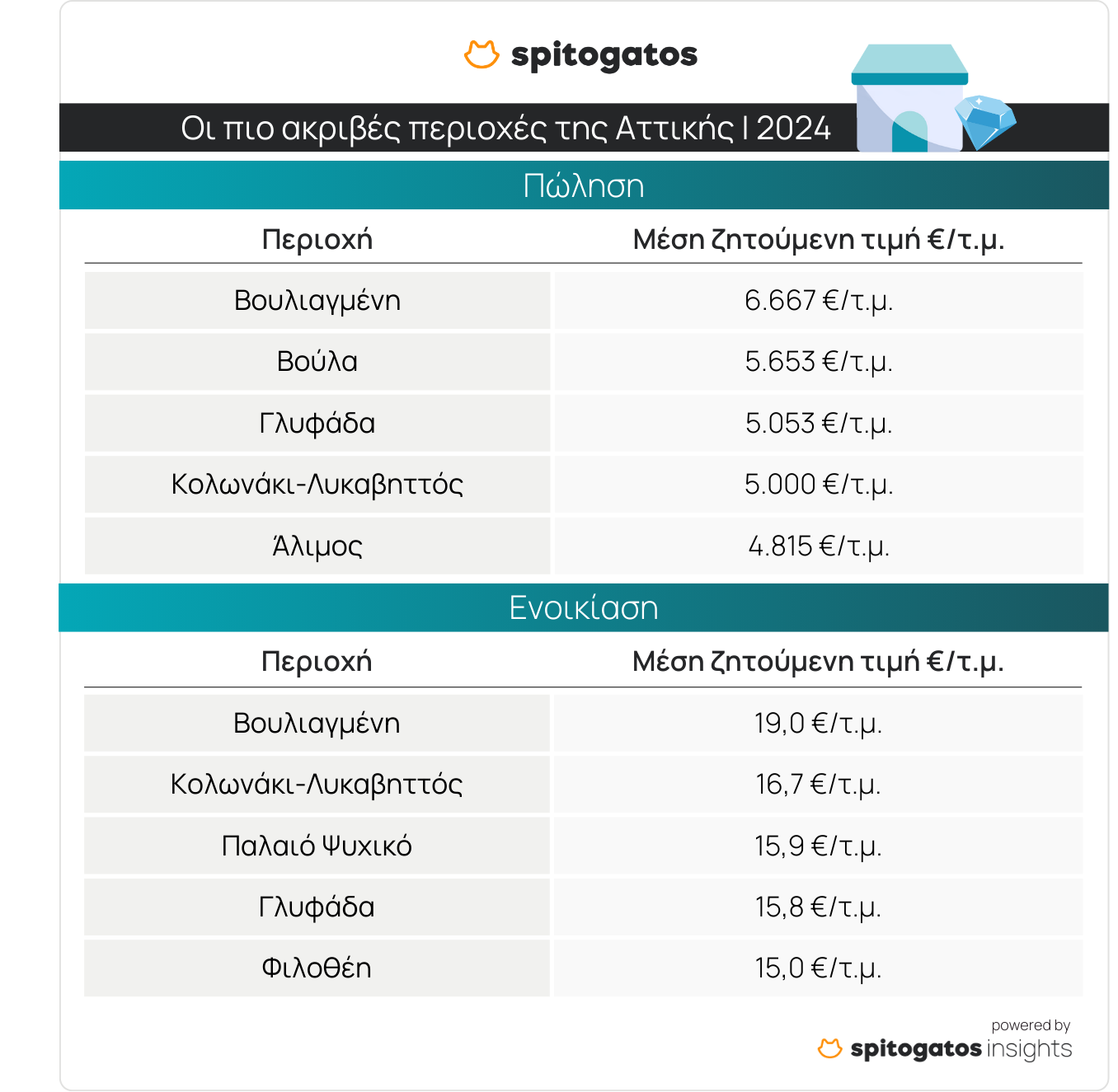 Οι περιοχές των Νοτίων Προαστίων της Αττικής καταλαμβάνουν τις πρώτες τρεις θέσεις στις υψηλότερες μέσες ζητούμενες τιμές πώλησης. Στην κορυφή βρίσκονται η Βουλιαγμένη, η Βούλα και η Γλυφάδα. Ακολουθούν το Κολωνάκι – Λυκαβηττός και ο Άλιμος.