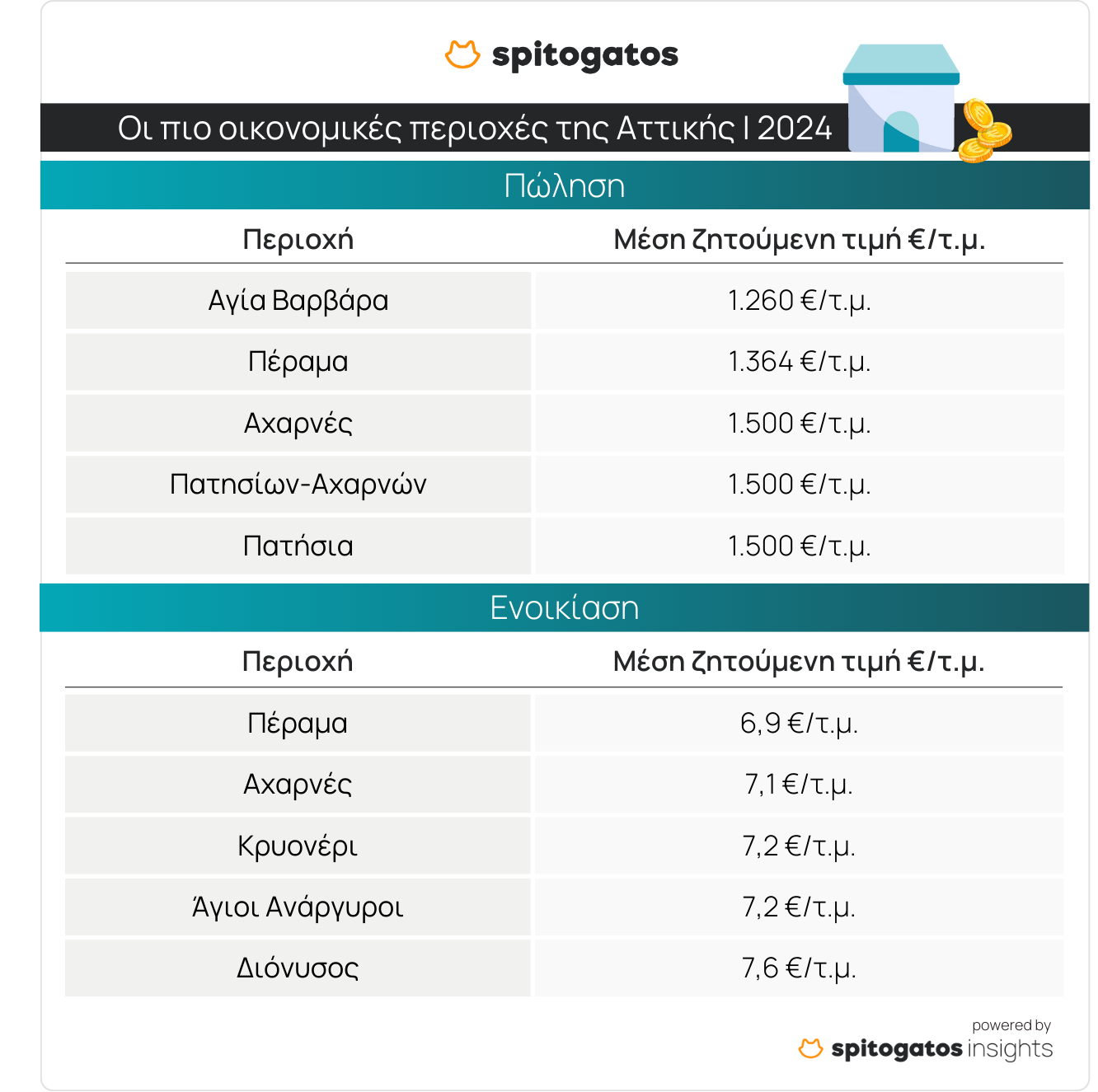 Οι πιο οικονομικές περιοχές της Αττικής για αγορά κατοικίας το 2024 εντοπίζονται στον Κεντρικό Τομέα Αθηνών, στα Δυτικά καθώς και στα Προάστια του Πειραιά. Στις πιο οικονομικές περιοχές της Αττικής, τόσο για αγορά όσο και για ενοικίαση κατοικίας το 2024, κατατάσσονται το Πέραμα και οι Αχαρνές. Στο κομμάτι της πώλησης, οι πιο οικονομικές επιλογές για όσους ενδιαφέρονται να αγοράσουν κατοικία εντοπίζονται στην Αγία Βαρβάρα, στην περιοχή Πατησίων – Αχαρνών, καθώς και στα Πατήσια. Στις πιο οικονομικά προσιτές περιοχές της Αττικής για ενοικίαση κατοικίας το 2024, σύμφωνα με τα στοιχεία του Spitogatos, κατατάσσονται το Κρυονέρι, οι Άγιοι Ανάργυροι και ο Διόνυσος.