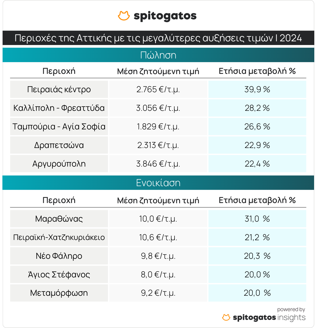 Οι περιοχές του Πειραιά και των Προαστίων του πρωταγωνίστησαν το 2024 στην πώληση κατοικιών, αφού σημείωσαν τις υψηλότερες αυξήσεις στη μέση ζητούμενη τιμή πώλησης στην Αττική. Ειδικότερα, το Κέντρο του Πειραιά κατέγραψε τη μεγαλύτερη αύξηση, με εντυπωσιακή μεταβολή 39,9% σε σχέση με το 2023. Αμέσως μετά, έχουμε τις περιοχές Καλλίπολη – Φρεαττύδα, Ταμπούρια – Αγία Σοφία και Δραπετσώνα. Την πεντάδα έρχεται να συμπληρώσει η Αργυρούπολη (Νότια Προάστια).