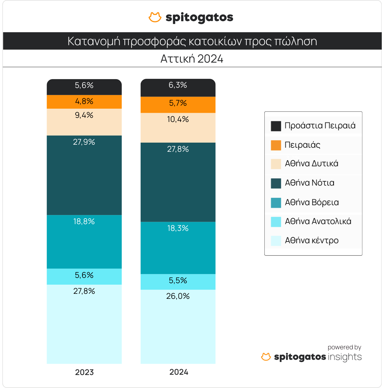 Αναλύοντας την κατανομή της προσφοράς κατοικιών προς πώληση στην Αττική το 2024, παρατηρούμε ότι το Κέντρο της Αθήνας και τα Νότια Προάστια συγκεντρώνουν πάνω από το 50% της προσφοράς, εικόνα παρόμοια με αυτή της κατανομής το 2023. Ακολουθούν τα Βόρεια Προάστια, τα οποία συγκεντρώνουν το 18,3% των προσφερόμενων κατοικιών προς πώληση στην Αττική το 2024, καθώς και τα Δυτικά Προάστια με ποσοστό 10,4%.