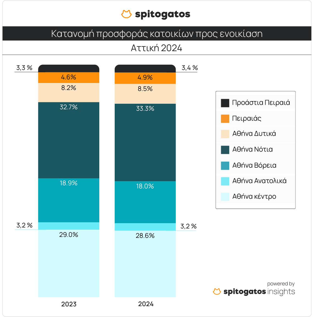Παρόμοια είναι και η εικόνα στην ενοικίαση κατοικιών, όπου το Κέντρο της Αθήνας και τα Νότια Προάστια συνιστούν και πάλι άνω του 50% των προσφερόμενων κατοικιών προς ενοικίαση στην Αττική. Σε μικρότερα ποσοστά ακολουθούν τα Βόρεια και τα Δυτικά Προάστια.