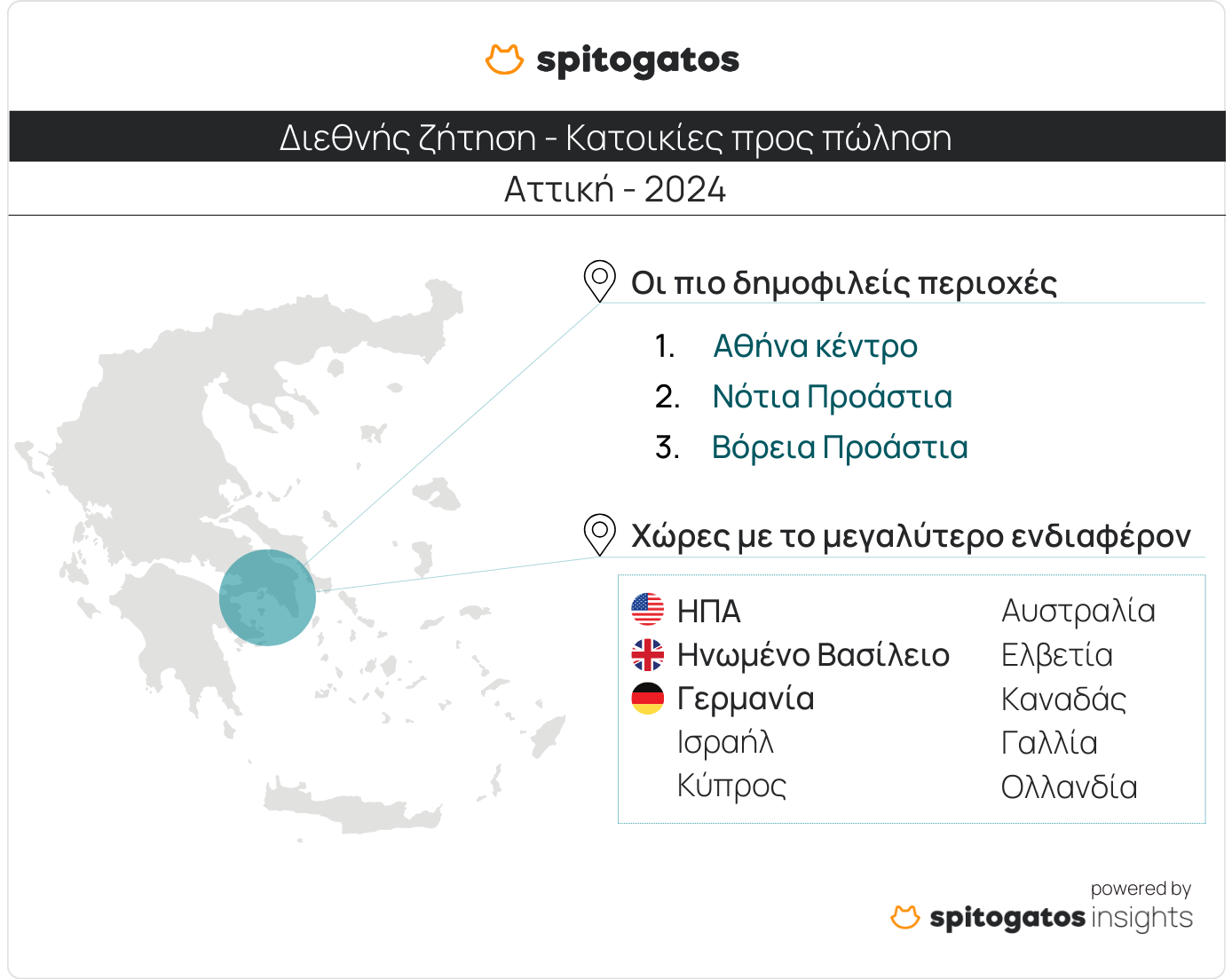 Σε ό,τι αφορά τη διεθνή ζήτηση για αγορά κατοικιών στην Αττική το 2024, στην κορυφή των προτιμήσεων των ξένων αγοραστών βρίσκεται το Κέντρο της Αθήνας, τα Νότια αλλά και τα Βόρεια Προάστια. Οι πιο δημοφιλείς τύποι κατοικίας προς πώληση για τους δυνητικούς αγοραστές από το εξωτερικό είναι τα διαμερίσματα, οι μονοκατοικίες και οι μεζονέτες. Τέλος, οι χώρες με το μεγαλύτερο ενδιαφέρον για κατοικίες προς πώληση στην Αττική είναι οι Ηνωμένες Πολιτείες της Αμερικής, το Ηνωμένο Βασίλειο, η Γερμανία, το Ισραήλ, η Κύπρος, η Αυστραλία, η Ελβετία, ο Καναδάς, η Γαλλία και η Ολλανδία.