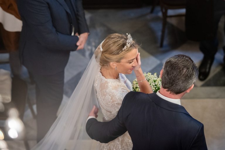 Το μακρύ πέπλο της εντυπωσίασε τους παρευρισκόμενους, ενώ τα μαλλιά της κοσμούσε μια τιάρα αντίκα, από τη συλλογή της Άννας Μαρίας.