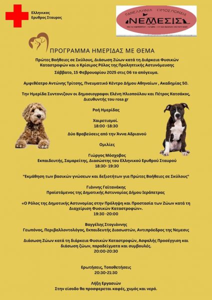 Η ημερίδα με θέμα: «Διάσωση ζώων κατά τη διάρκεια φυσικών καταστροφών: Πρώτες βοήθειες και ο κρίσιμος ρόλος της προληπτικής αστυνόμευσης» θα πραγματοποιηθεί το Σάββατο 15 Φεβρουαρίου.