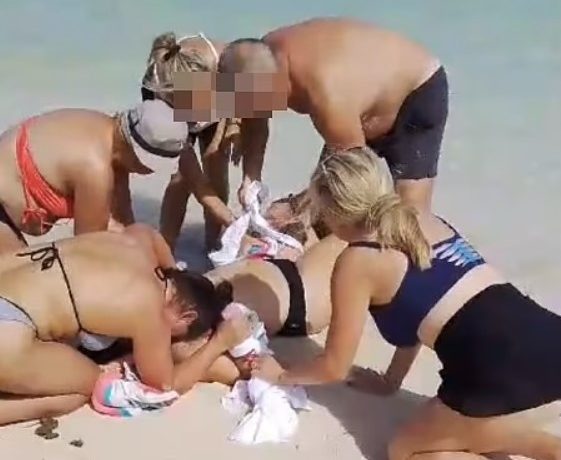 Εικόνες που δημοσιεύτηκαν, δείχνουν τη γυναίκα αιμόφυρτη στην παραλία, να δέχεται βοήθεια από τους γύρω της, οι οποίοι προσπαθούσαν να σταματήσουν την αιμορραγία.