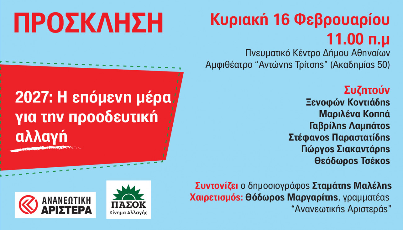 Εκδήλωση την Κυριακή 16 Φεβρουαρίου στις 11 το πρωί στο Πνευματικό Κέντρο του Δήμου Αθηναίων. Στελέχη της Ανανεωτικής Αριστεράς του ΠΑΣΟΚ συζητούν για τη συνεργασία στην λεγόμενη κεντροαριστερά.