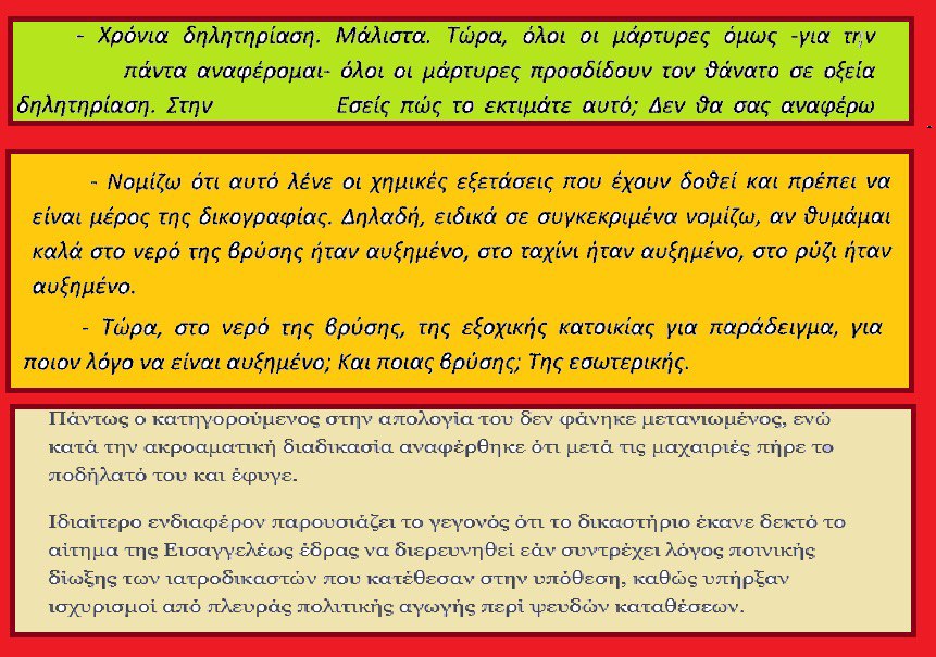 Μάλιστα οι τοπικοί ιατροδικαστές της Λάρισας που ελέγχθηκαν γιατί δεν έκαναν τις τοξικολογικές εξετάσεις στο αιτιολογικό υπόμνημα τους (σελίδα 8) ανέφεραν για τους εν λόγω σημαντικούς ιατροδικαστές που ήλθαν από την Αθήνα κι αλλού ότι «ουδεμία σύσταση κι επισήμανση δεν μας έδωσαν για λήψη τοξικολογικών εξετάσεων».