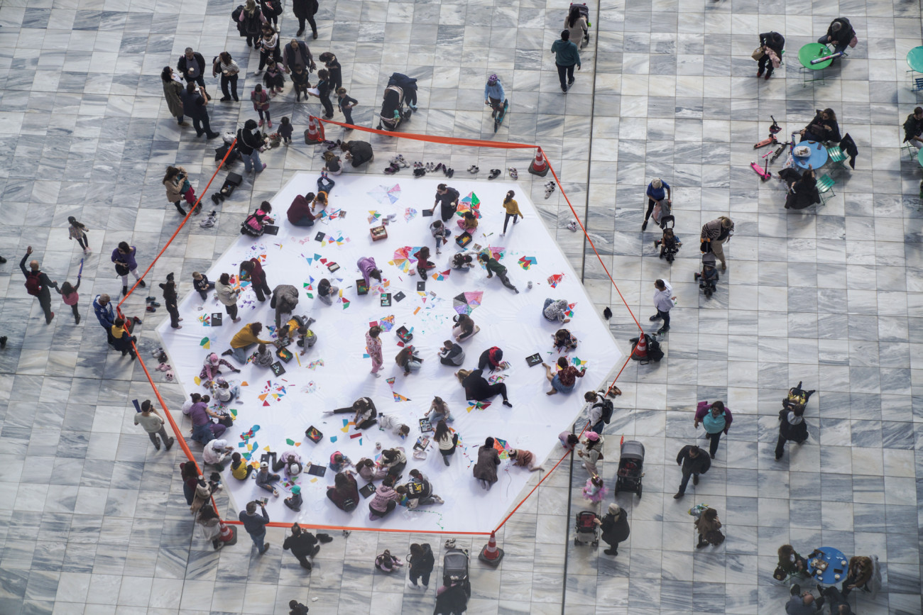 Στην Αγορά του ΚΠΙΣΝ παιδιά και γονείς θα δημιουργήσουν ένα μεγάλο συλλογικό έργο σε χαρτί του μέτρου, αντλώντας έμπνευση από τις δυναμικές συνθέσεις του Νίκου Χατζηκυριάκου-Γκίκα, όπου οι χαρταετοί αιωρούνται πάνω από τις πόλεις και τα χωριά σαν αιώνια σύμβολα της ελευθερίας και της ανανέωσης.