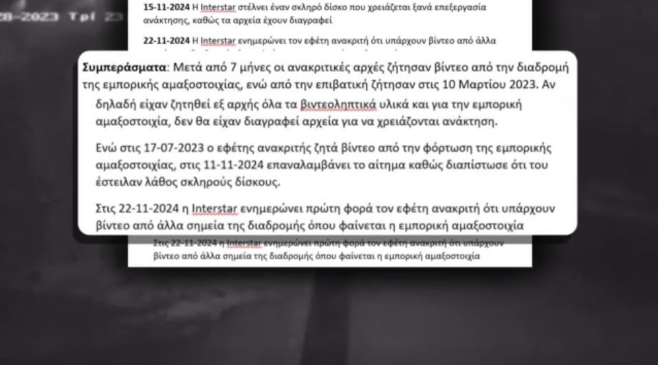 Σύμφωνα με την αποκάλυψη του MEGA, επτά μήνες μετά το δυστύχημα ζητήθηκε για πρώτη φορά υλικό από την διαδρομή της εμπορικής αμαξοστοιχίας, ενώ για την επιβατική αμαξοστοιχία η γ’ ανακρίτρια που είχε αναλάβει την υπόθεση, είχε ζητήσει από την Ελληνική Αστυνομία να λάβει το υλικό από την Interstar στις 10/3/23 δηλαδή 10 μέρες μετά το τραγικό δυστύχημα.